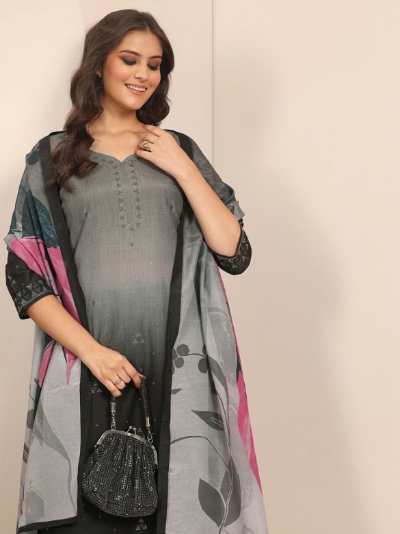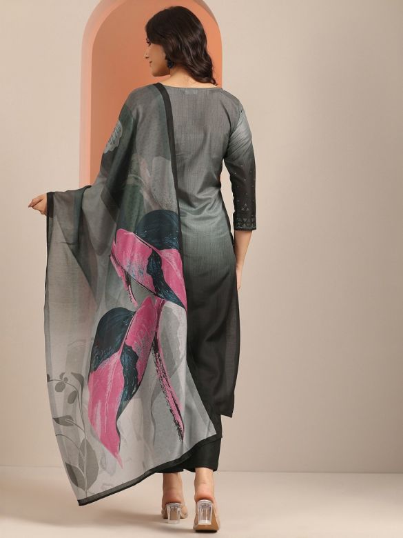 Elegant navy pant-style suit with fine embroidery, ideal for casual and semi-formal occasions.