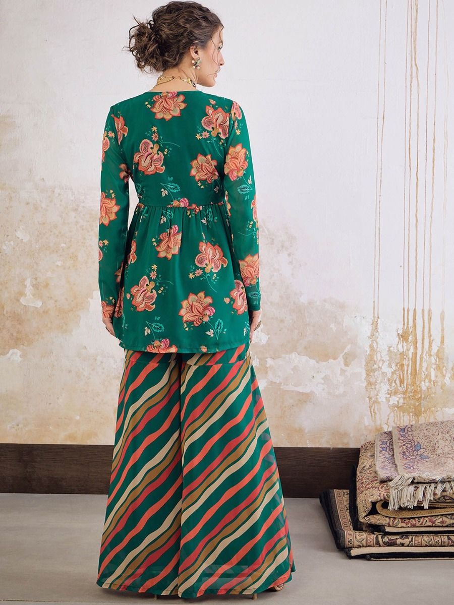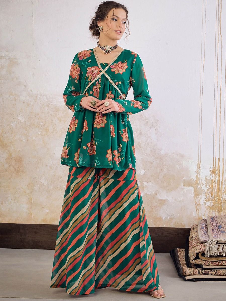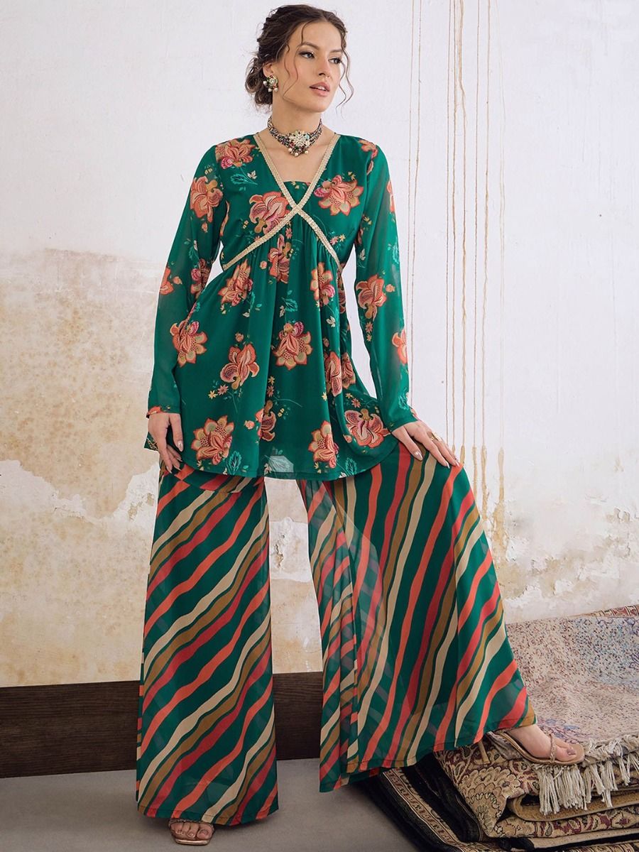 A stylish peach Palazzo suit with delicate thread embroidery, perfect for casual outings and festive occasions.