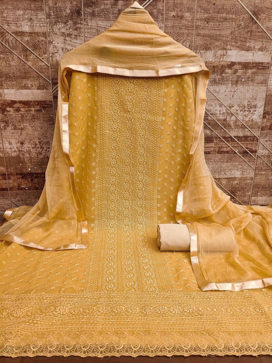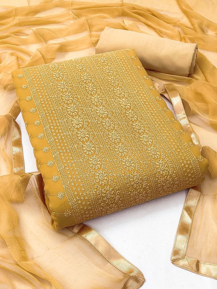 Premium georgette dress material with delicate floral embroidery, perfect for festive wear.