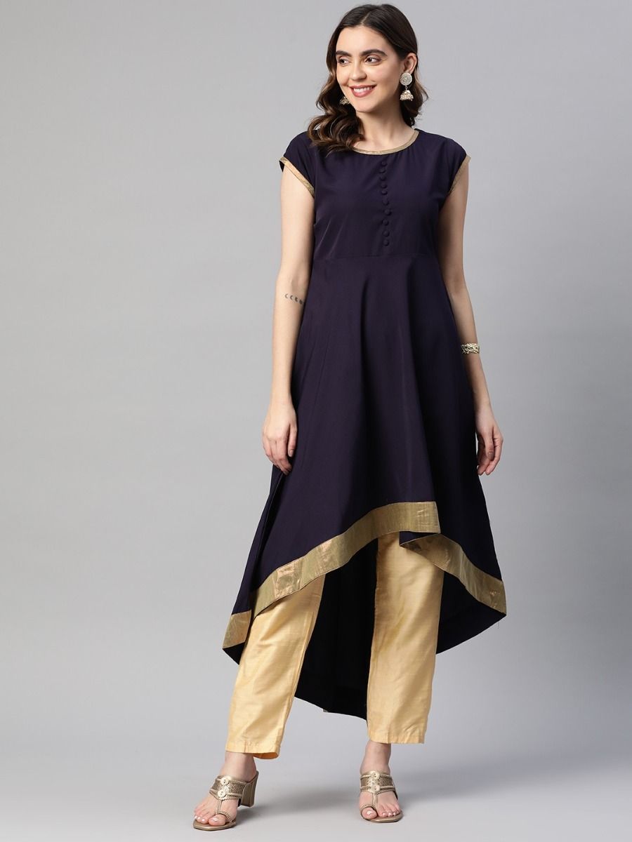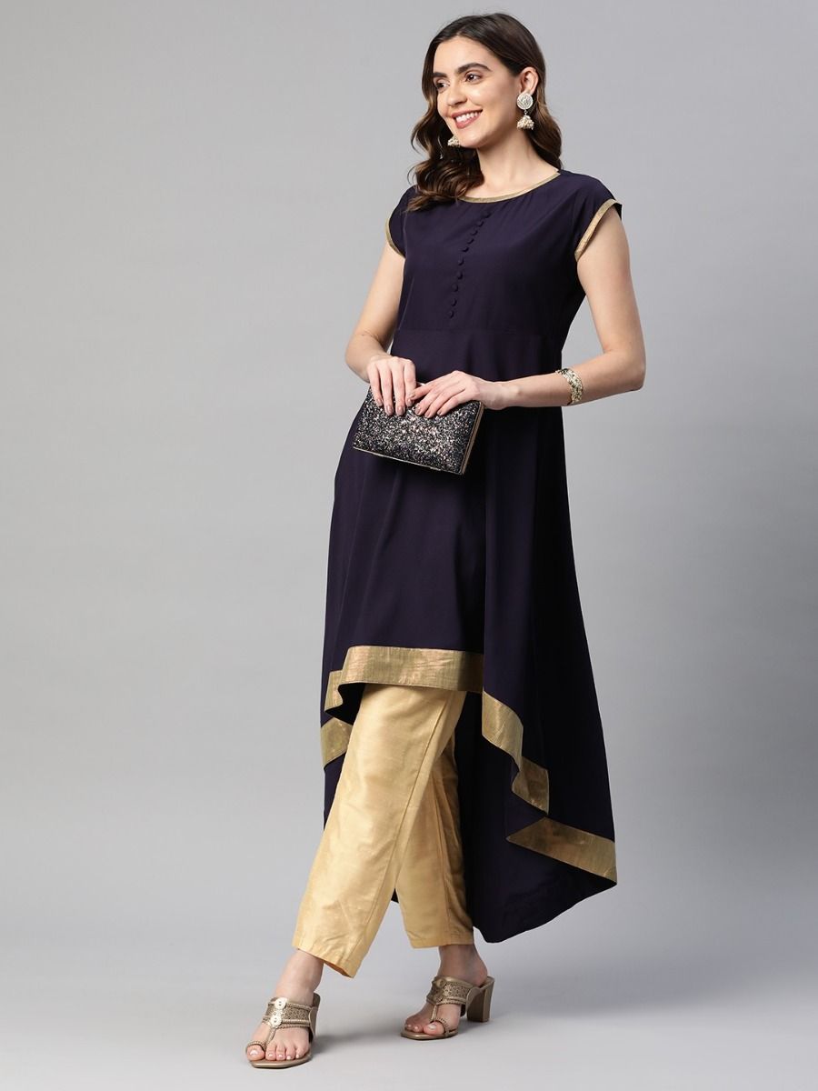 Elegant royal blue cape-style suit with delicate embroidery and flowing cape, perfect for festive and formal occasions.